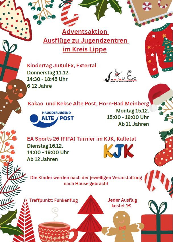 Wie bereits angekündigt, machen wir bei der gemeinsamen Adventsaktion der Jugendzentren im Kreis Lippe mit und bieten in den nächsten Wochen tolle Ausflüge für euch an!