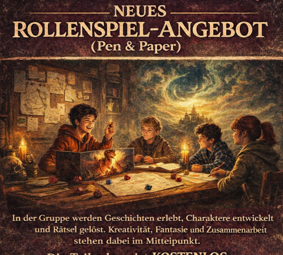 Beim Rollenspiel-Treff schlüpfst du in eine eigene Rolle, spielst gemeinsam mit anderen und erlebst eine spannende Geschichte.